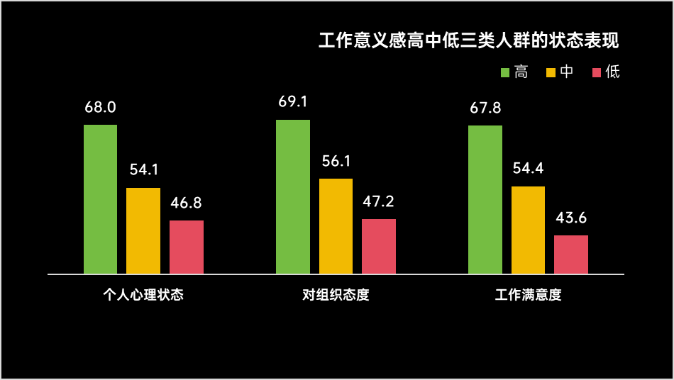 积极状态关联:工作意义感高的人群,个人心理状态得分为68.0分,对组织态度为69.1分,工作满意度为67.8分;工作意义感中的人群,个人心理状态得分为54.1分,对组织态度为56.1分,工作满意度为54.4分;工作意义感低的人群,三项指标分别为46.8分、47.2分、43.6分,呈阶梯式降低。