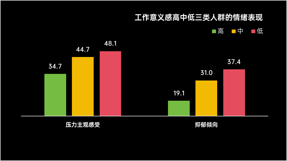 负面状态关联:工作意义感高的人群,压力主观感受为34.7分,抑郁倾向为19.1分;工作意义感中的人群,压力主观感受为44.7,抑郁倾向为31.0;而工作意义感低的人群,压力主观感受高达48.1分,抑郁倾向为37.4分。工作意义感越低,压力主观感受和抑郁倾向越高。